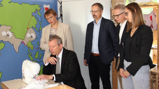 Gemeinsam mit den Sponsoren des Science Camp öffnete Oberbürgermeister Dr. Ulrich Maly die Online-Anmeldung für das Science Camp 2018. Zuvor durfte sich Dr. Maly allerdings selbst in der „Textilwerkstatt“ an der Nähmaschine versuchen. Diese wird eines der Themenblöcke des Camps darstellen, um Kindern die Wichtigkeit fairer und gerechter Löhne weltweit näher zu bringen.