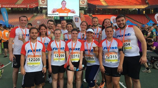 15 Mitarbeiterinnen und Mitarbeiter der Fürst Gruppe haben beim diesjährigen B2Run die Schnürsenkel geschnürt und ihr Bestes gegeben. Bei Temperaturen von über 30 Grad meisterten sie die 6,3 Kilometer lange Strecke rund um den Kleinen und Großen Dutzendteich. Noch etwas außer Puste, aber überglücklich, als Team dabei gewesen zu sein, waren sich nach dem Zieleinlauf ins Max-Morlock-Stadion alle einig, dass es ein „super tolles Gefühl ist, im Ziel angekommen zu sein“. Insgesamt gingen 17.500 Läuferinnen und Läufer von 650 Unternehmen an den Start.