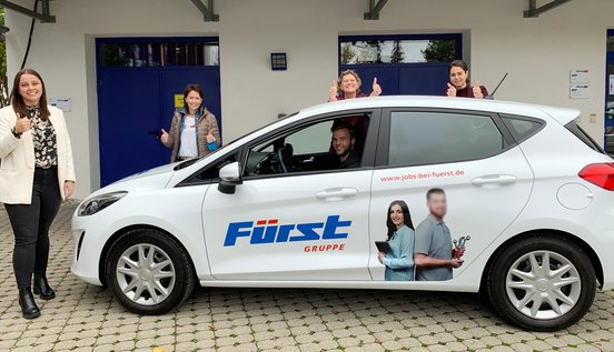 Das Azubi-Fahrzeug wartete bereits im Innenhof der Hauptverwaltung auf seinen neuen Besitzer. Andrea Wagner, Leiterin Fuhrpark und Schadensmanagement bei der Fürst Gruppe, überreichte Marvin Skach die Schlüssel zu seinem 100PS-starken Ford Fiesta. Zur Feier des Tages stieß man mit alkoholfreiem Sekt an, um die folgende Probefahrt mit dem neuen Fürst-Fahrzeug nicht zu gefährden.