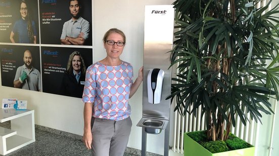 Durch einen Kollegen erfuhren wir von einem Kunden, der seine Mitarbeiterinnen und Mitarbeiter in Kurzarbeit schicken musste. Daraus entstand die gemeinsame Idee, durch den Kunden Desinfektionssäulen aus Edelstahl produzieren zu lassen und diese im Anschluss unserem Kundenkreis anzubieten. Dadurch konnte der Betrieb des Kunden wieder vollständig aufgenommen werden und Fürst konnte seinen Kunden so einen Mehrwert bieten. „Wir haben alle Kunden angeschrieben und neben der Säule auch den regelmäßigen Tausch der Kartuschen durch uns angeboten. Ich habe im Akkord Angebote geschrieben, Bestellungen abgewickelt und die Auslieferungen geplant“, berichtet Stefanie Hemmer.