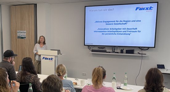 Nach einer kurzen Pause zeigte Stefanie Hemmer, Referentin soziale Verantwortung und nachhaltige Unternehmensprojekte, wie breit unser Engagement tatsächlich ist. Von zyklusbasierten Gesundheitsimpulsen für Frauen über unseren Kindermitbringtag und das Azubi-Kompetenzzentrum bis hin zu unserem Herzensprojekt „Wege in die digitale Welt für Ältere“ – bei Fürst steht der Mensch im Mittelpunkt. Auch unsere Fürst Stiftung, die nachhaltige soziale Projekte fördert, fand großen Anklang bei den Besucher:innen.